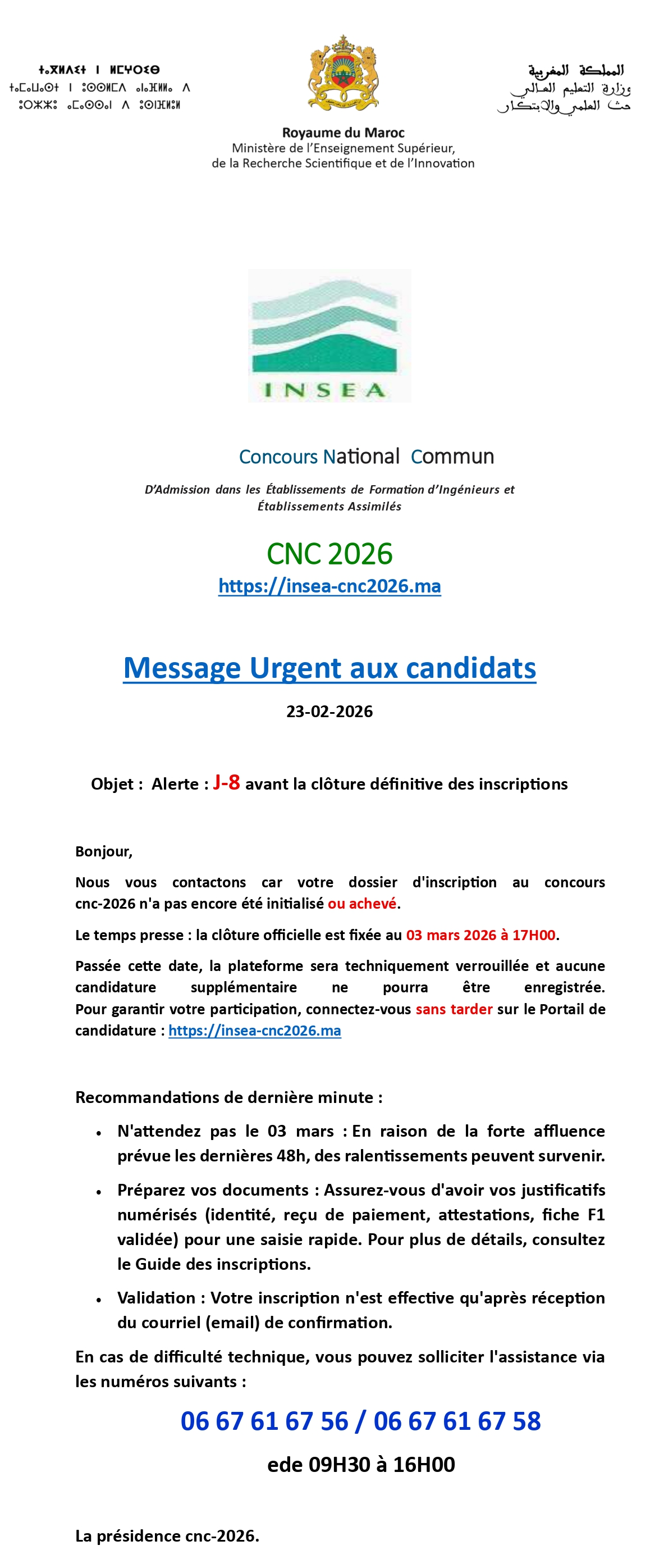 Toutes les communications officielles relatives au Concours National Commun 2026. Chaque annonce est accompagnée du document de référence à télécharger.